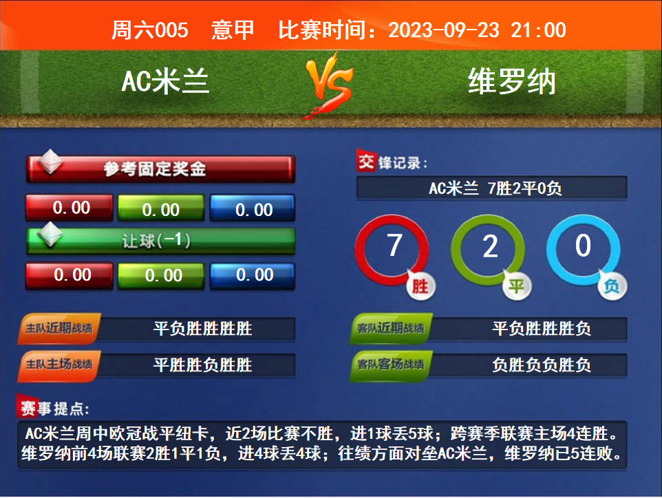 比賽時(shí)間:2023-09-23 21:00賽事提點(diǎn):AC米蘭周中歐冠戰(zhàn)平紐卡,近2場比賽不勝,進(jìn)1球丟5球;跨賽季聯(lián)賽主場4連勝。維羅納前4場聯(lián)賽2勝1平1負(fù),進(jìn)4球丟4球;往績方面對壘AC米蘭,維羅納已5連敗。