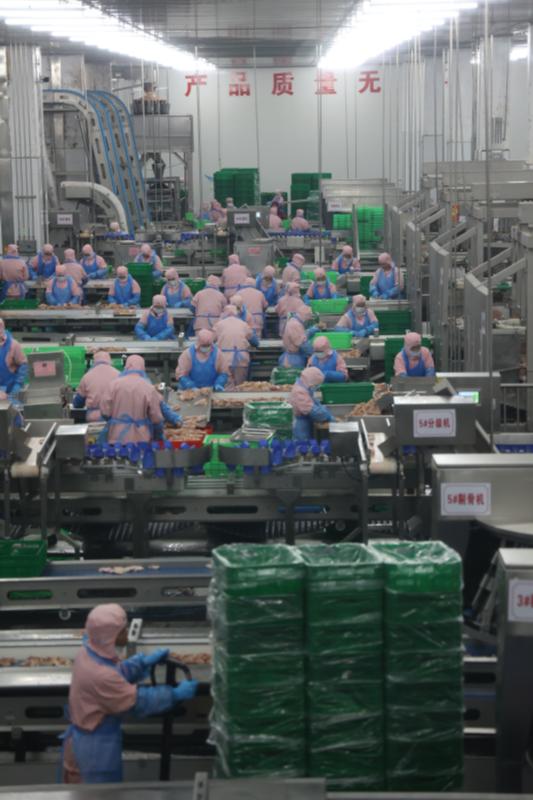宰殺廠房的燈光比掛雞處的更暗了,除了星星點點的監(jiān)控燈光,幾乎看不到白羽活雞的運動軌跡。僅僅一步之遙,進入打毛間和掏膛間,白羽雞進行退毛,去頭和去爪后,等待清潔預冷和被精準分割為雞腿、雞翅、雞胸肉等產(chǎn)品。