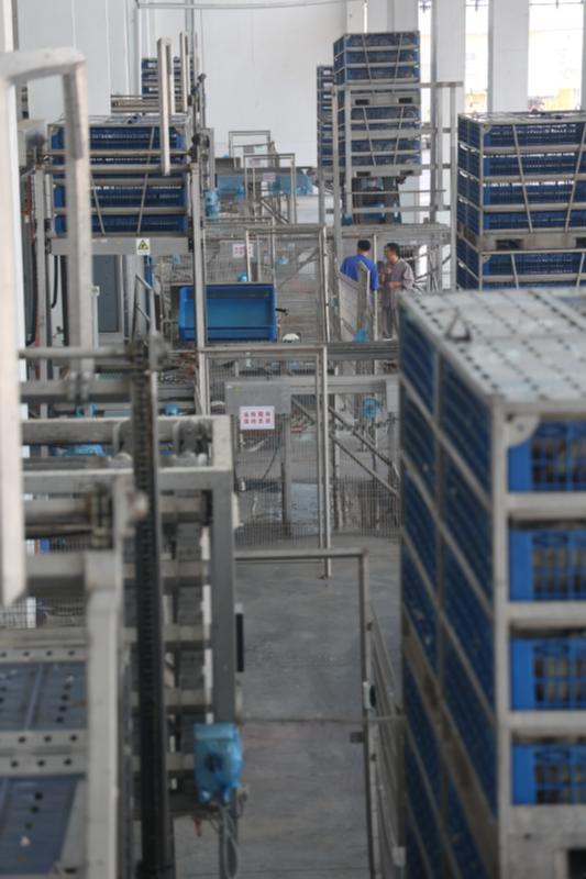 宰雞第一步先消毒,一筐筐自動分好的白羽活雞上架后即得到?jīng)_洗,“干干凈凈”地進入下一程序——掛雞。步驟與步驟銜接中的自動化程度很高,掛雞室光線略暗?!拔覀儾捎脟H化標準,宰殺環(huán)節(jié)在暗室進行?!毕嚓P(guān)人員說。