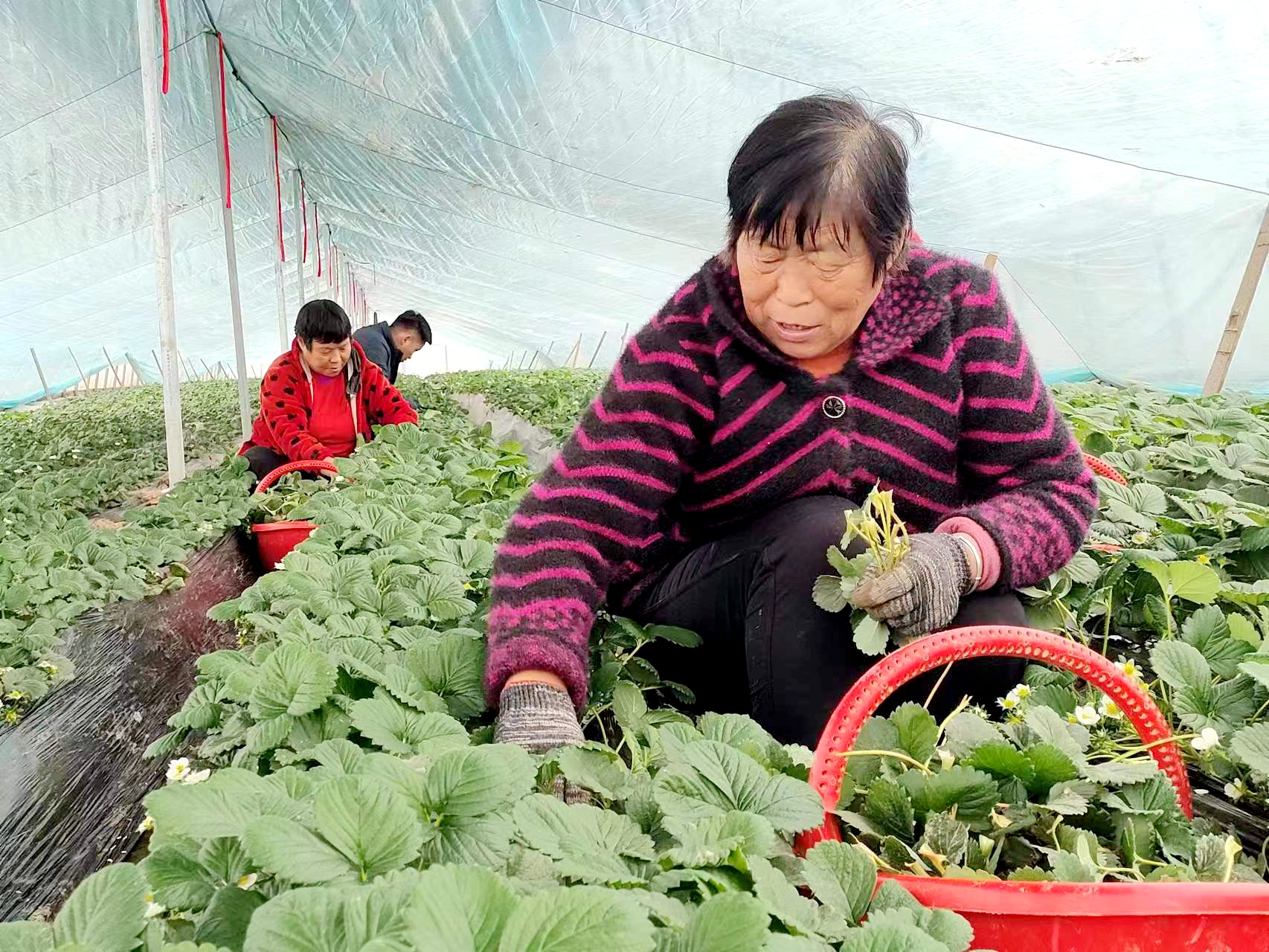 在田廣水的草莓采摘園,一股清香撲鼻而來。綠油油的草莓葉下,一顆顆鮮紅欲滴的草莓長勢喜人,十分誘人。這里的20多畝草莓已經(jīng)開始結(jié)果成熟上市?!俺醵乃贩N本來很少,我們大棚種植的‘紅顏’草莓香甜、肉厚、口感好,大人孩子都很喜歡吃?!碧飶V水說,草莓園成熟季雇用工人近30人,全部來自村里的留守婦女、老人及脫貧監(jiān)測戶。