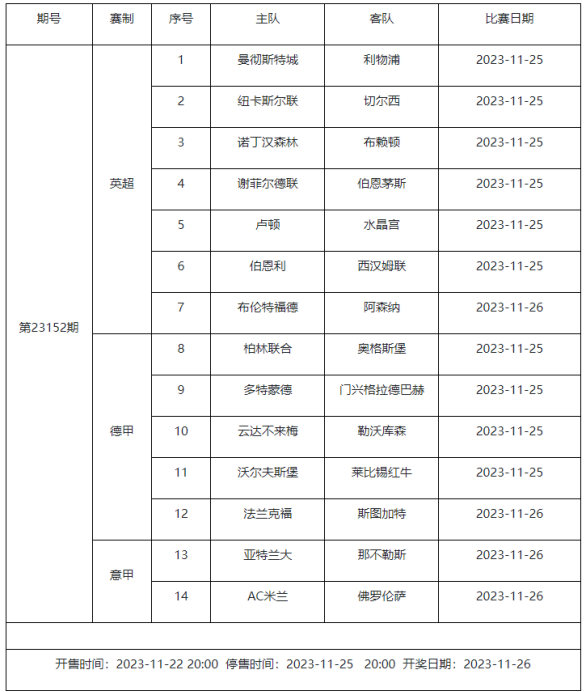 足球彩票勝負(fù)游戲(14場(chǎng)和任選9場(chǎng))第23152期賽程: