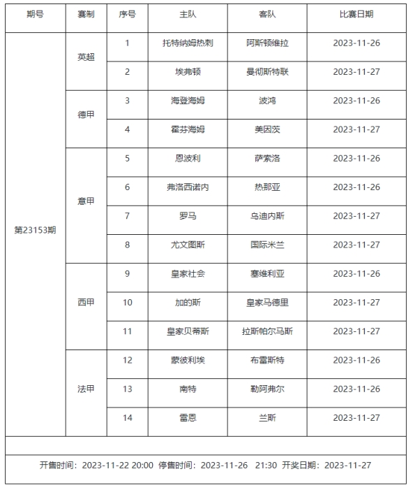 足球彩票勝負(fù)游戲(14場和任選9場)第23153期賽程: