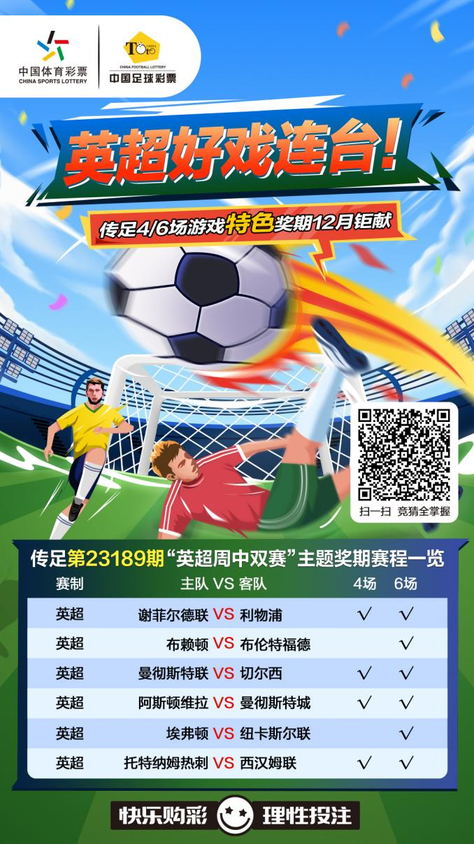 第23189期傳足特色獎期已經于12月3日20:00開售,將于12月6日22:00停售,并于12月8日開獎。其中謝菲爾德聯(lián)VS利物浦、曼聯(lián)VS切爾西、阿斯頓維拉VS曼城和熱刺VS西漢姆聯(lián)為4場進球游戲競猜賽事。