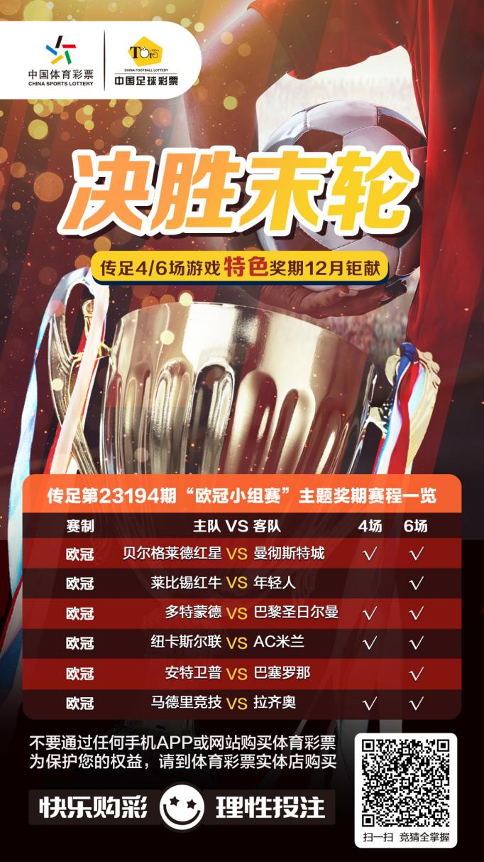 第23194期傳足特色獎期已經(jīng)于12月10日20:00開售,將于12月13日22:00停售,并于12月14日開獎。其中貝爾格萊德紅星VS曼徹斯特城、多特蒙德VS巴黎圣日爾曼、紐卡斯?fàn)柭?lián)VSAC米蘭和馬德里競技VS拉齊奧為4場進球游戲競猜賽事。
