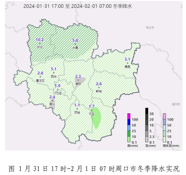 1月31日17時—2月1日7 時,我市出現(xiàn)小雨轉雨夾雪、北部地區(qū)中到大雪天氣。截止到1日7時。國家站累計雨雪量(毫米)為:扶溝10.2、太康5.8、西華5.1、鹿邑3.1、黃泛區(qū)2.8、鄲城 2.6、商水 2.4、淮陽 2.3、川匯區(qū) 1.9、沈丘1.7、項城1.1。各地區(qū)7時雪深(厘米):太康5、扶溝4、西華4、黃泛區(qū)1、鹿邑1。