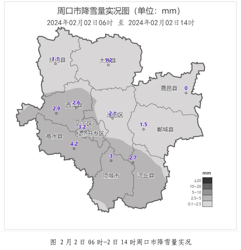 過程累計雨雪量:1月31日14時﹣2月2日14時,最大雨雪量出現(xiàn)在扶溝 11.4 毫米,全市平均 7.3 毫米。各國家站累計雨雪量(毫米):扶溝11.4、沈丘9.8、商水9.1、西華8.4、項城8.2、川匯區(qū)7.6、太康7.5、鄲城7.2、黃泛區(qū)6.7、淮陽6.0、鹿邑5.4。