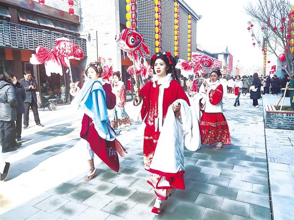 翠袖紅裙、直襟長(zhǎng)袍……身著漢服的演員,手持魚(yú)燈,巡游關(guān)帝老街,伴隨著樂(lè)曲翩翩起舞,成為一道靚麗的風(fēng)景線(xiàn)。