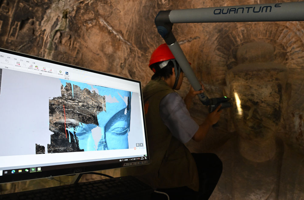 2025年4月9日,武漢大學(xué)文化遺產(chǎn)智能計(jì)算實(shí)驗(yàn)室團(tuán)隊(duì)成員在魏字洞使用關(guān)節(jié)臂掃描儀對佛像進(jìn)行數(shù)字化掃描。圖片來源新華社