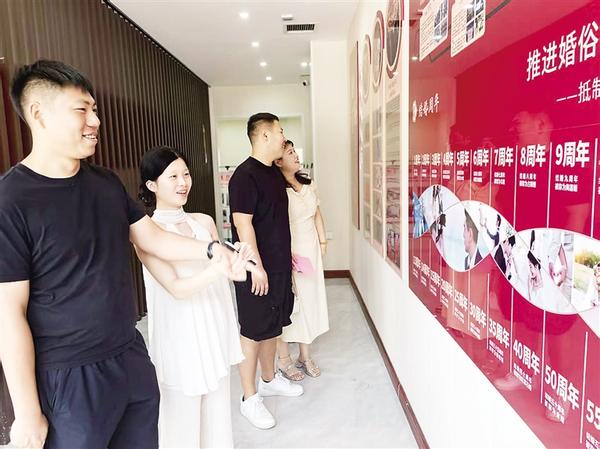 近年來,沈丘縣加大精神文明建設(shè)力度,通過舉辦文化大講堂等活動,在廣大群眾中形成“天價彩禮不可取,鋪張浪費最可恥,陳規(guī)陋習危害大”的共識,許多年輕人在耳濡目染中受到熏陶,新事新辦蔚然成風。圖為8月29日,農(nóng)歷七月初七,結(jié)婚登記的新人在婚史展板前駐足。