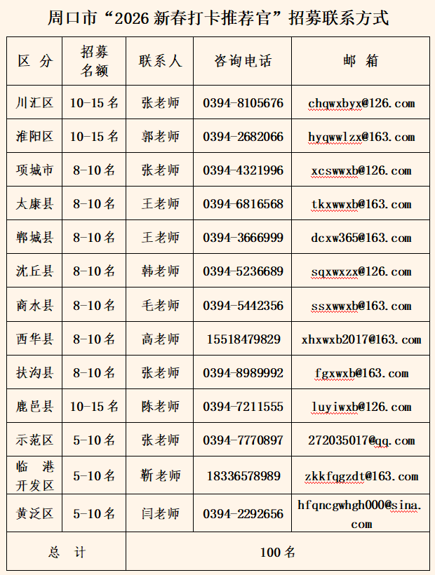 新春佳節(jié)將至,為展現(xiàn)周口城市活力與新春節(jié)日傳統(tǒng)文化魅力,現(xiàn)面向全市公開(kāi)招募100名“2026新春打卡推薦官”,特邀請(qǐng)您用鏡頭記錄年味,用創(chuàng)意傳遞新春祝福。