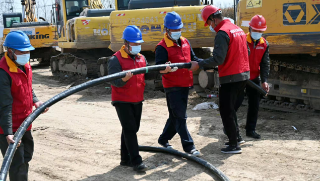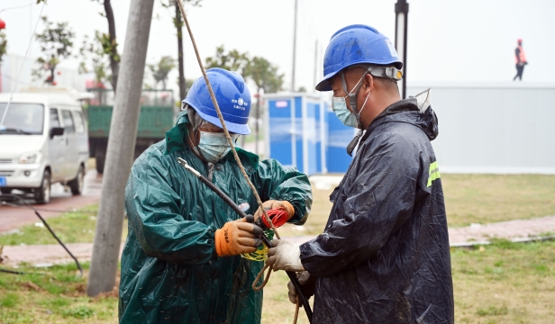 3月25日,在太康縣北環(huán)路核酸檢測方艙和隔離方艙建設(shè)現(xiàn)場,國網(wǎng)太康縣供電公司工作人員正冒雨施工為其提供電力保障。