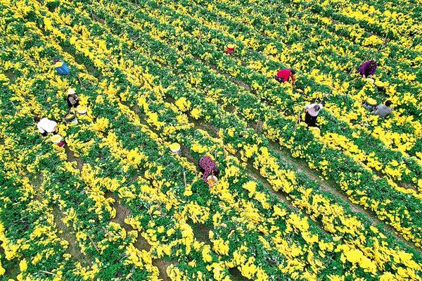 11月13日,項城市新橋鎮(zhèn)南趙村村民在田間采摘金絲皇菊。剛剛離枝的新鮮菊花隨即被送往村里的加工車間烘干,之后由專業(yè)合作社統(tǒng)一收購并對外銷售。