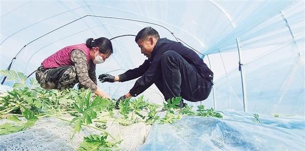 3月15日,在扶溝縣江村鎮(zhèn)江北村現(xiàn)代農(nóng)業(yè)產(chǎn)業(yè)園的大棚里,農(nóng)戶在管理西瓜苗。該園區(qū)占地500余畝,主要種植麒麟美都西瓜、太陽(yáng)花水果玉米、優(yōu)質(zhì)菠菜,預(yù)計(jì)每畝年綜合收益1.2萬(wàn)元,輻射帶動(dòng)周邊200余名群眾在家門(mén)口就業(yè)。