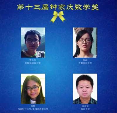 中國數(shù)學(xué)會(huì)21日揭曉了第十三屆華羅庚數(shù)學(xué)獎(jiǎng)、第十六屆陳省身數(shù)學(xué)獎(jiǎng)和第十三屆鐘家慶數(shù)學(xué)獎(jiǎng)的獲獎(jiǎng)名單。今年獲得鐘家慶數(shù)學(xué)獎(jiǎng)的分別是美國斯坦福大學(xué)的樊玉偉(來自河南周口)、首都師范大學(xué)的張蕊、西南財(cái)經(jīng)大學(xué)和美國密西根大學(xué)的周嶺、浙江大學(xué)的周青龍等4名博士生?!?a href="http://www.zzjbh888.com/content/2017-10/23/content_581562.htm" target="_blank" >[詳細(xì)]