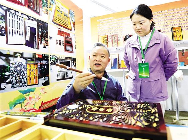 3月1日,在淮陽伏羲文化廣場非遺展示大廳,省級(jí)非物質(zhì)文化遺產(chǎn)代表性項(xiàng)目汝陽劉毛筆——御筆坊第67代制筆傳承人劉愛華(右)和父親劉好奎展示毛筆新品。
