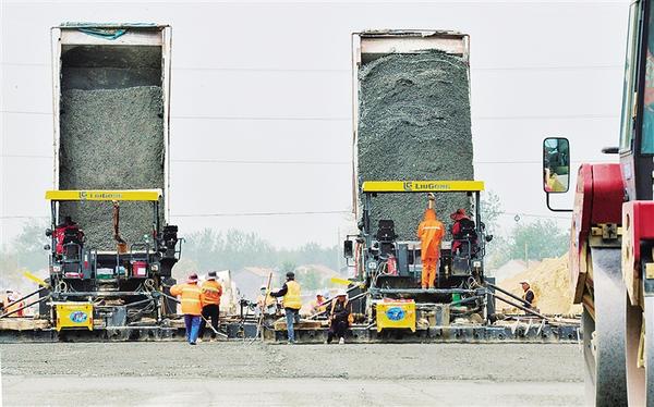 4月24日上午,工人們?yōu)?29國(guó)道改建路段鋪設(shè)第一層碎石路基。據(jù)了解,329國(guó)道改建路段全長(zhǎng)5.879公里,西起商水縣童崗村,折而向南又向東,至后趙寨村,呈直角形,為城市主干道,雙向八車道。