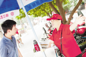 8月28日,55歲的志愿者徐麗華(右)在四川成都人民南路二段與濱江路交叉口的志愿者服務(wù)站為人指路。 炎炎夏日,許多志愿者活躍在四川成都的街頭巷尾,他們耐著高溫濕熱的天氣,為市民游客答疑解惑、提供力所能及的幫助。這些志愿者成了蓉城夏日街頭的一道靚麗風(fēng)景。 新華社發(fā)