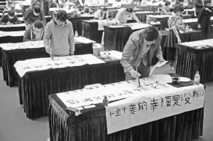 2015“金臺(tái)杯”世界大學(xué)生書法大賽復(fù)賽在京舉行 4月12日,參賽選手在現(xiàn)場(chǎng)書寫作品。當(dāng)日,由中國藝術(shù)教育促進(jìn)會(huì)主辦的2015“金臺(tái)杯”世界大學(xué)生書法大賽復(fù)賽在北京舉行。據(jù)了解,本次大賽初賽已于2014年11月完成,復(fù)賽按中國和外國兩大組分別進(jìn)行評(píng)選,最終在百余位參賽的選手中選出一等獎(jiǎng)、二等獎(jiǎng)、三等獎(jiǎng)和優(yōu)秀獎(jiǎng)。 新華社發(fā)