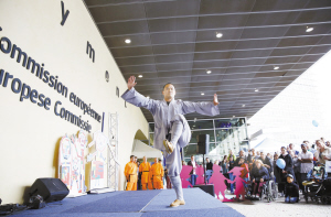 “中國角”首次現(xiàn)身歐盟開放日 5月9日,在比利時首都布魯塞爾歐盟委員會大樓下,中國武僧表演功夫。當(dāng)日是歐盟一年一度的開放日。因今年恰逢中歐建交40周年,中國成為歐盟成員國外唯一一個開設(shè)宣傳角的國家,也是1993年歐盟舉辦開放日以來中國首次參加,為今年的開放日增添了不少中國元素。新華社發(fā)