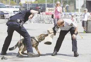 加拿大迎來(lái)全國(guó)警察周 5月9日, 在加拿大溫哥華地區(qū)的素里市,警察在警局開放日活動(dòng)上向民眾示范警犬訓(xùn)練情況。為迎接一年一度的全國(guó)警察周,素里市皇家騎警總部當(dāng)日舉辦開放日活動(dòng),向民眾展示警方裝備及介紹警隊(duì)日常工作。新華社發(fā)