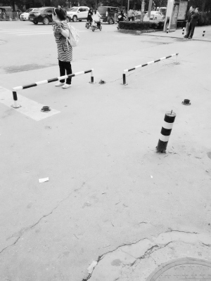 左圖 平原賓館門前的人行道不知被誰裝上了“黃杠杠”,行人只能繞行通過。