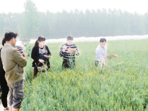 下圖:昨日,項城市農(nóng)科所技術(shù)人員正在進行小麥雜交授粉。連日來,該所抓住小麥授粉期的晴好天氣,組織技術(shù)人員開展雜交授粉實驗,確保小麥單產(chǎn)同步提高。(蔣樹保 攝)