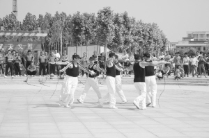 為進(jìn)一步推動全民健身活動的深入開展,項(xiàng)城市啟動了“全民健身月”活動,讓市民積極投身到全民健身行列中,努力使體育鍛煉經(jīng)?;?、個人健身生活化。圖為5月18日項(xiàng)城市鞭陀協(xié)會的會員正在進(jìn)行鞭陀健身展演。