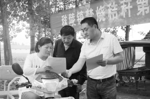 項(xiàng)城市秣陵鎮(zhèn)積極做好夏季秸稈禁燒工作,實(shí)行班子成員包片、機(jī)關(guān)干部包村、村組干部包戶責(zé)任制,全力構(gòu)筑了秸稈禁燒“防火墻”。圖為6月8日該鎮(zhèn)干部在李閣村向過(guò)往群眾發(fā)放禁燒宣傳單。(張永久 攝)