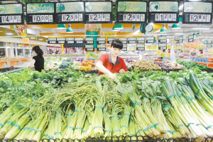 6月9日,一名工作人員正在市區(qū)一超市內(nèi)擺放蔬菜。當(dāng)日,國家統(tǒng)計局發(fā)布的數(shù)據(jù)顯示,2015年5月,全國居民消費價格總水平同比上漲1.2%。(牟宇 攝)