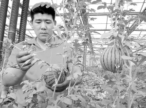 扶溝縣豫星農(nóng)業(yè)發(fā)展有限公司種植的“迷你彩虹西瓜”,以個(gè)小、皮薄、甜度高暢銷省內(nèi)外,畝均收入達(dá)3萬元。圖為員工正在為“彩虹西瓜”整枝打杈。(谷志方 攝)