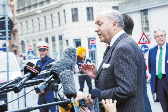 新一輪伊核問題談判在維也納舉行 6月27日,在奧地利首都維也納,法國外交部長法比尤斯在舉行新一輪伊核問題談判的柯堡宮殿酒店外接受記者采訪。當(dāng)日,伊朗核問題六國、歐盟與伊朗在奧地利首都維也納柯堡宮殿酒店展開新一輪磋商。