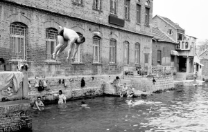 7月14日,一名濟南市民在濟南市王府池子跳水游泳。當天,濟南市最高氣溫超過39攝氏度,為10年以來同期最高氣溫。